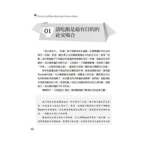 如本書再三強調的,吃飯是重要的交際手段之一。說得嚴重一點,吃飯還可以是場聲勢浩大的「戰場」,商場上很多的爾虞我詐都是在餐桌上決定出勝敗的。