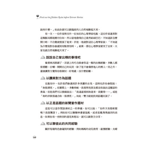 我們說,話題並不是憑空出現的,而是需要先「製造」和「準備」,例如你事先瞭解這次的餐會賓客們的背景,如果是汽車相關產業,即便你不會開車,那你也得先翻翻幾本汽車雜誌看看,以便到時候能容易進入狀況。