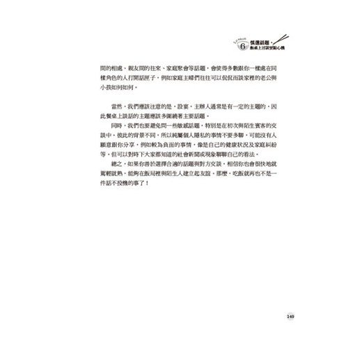 談中。彼此的背景不同,所以純屬個人隱私的事情不要多聊,可能沒有人願意跟你分享,例如較為負面的事情,像是自己的健康狀況及家庭糾紛等。但可以對時下大家都知道的社會新聞或現象聊聊自己的看法。