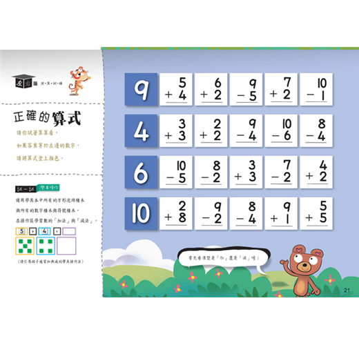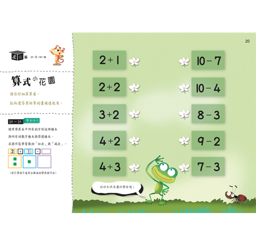 唱數計術/數量對應/合成/分解/進位/比較/錢幣/時間/估量測量/圖形組和/部分整體/空間/路徑/辨識/分類集合/配對/序列