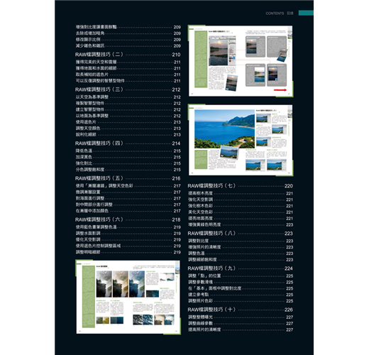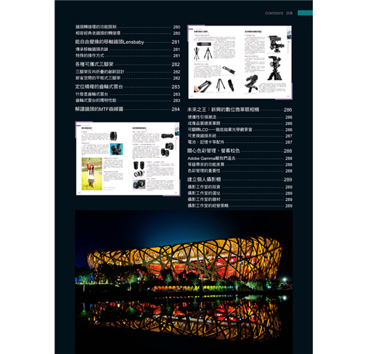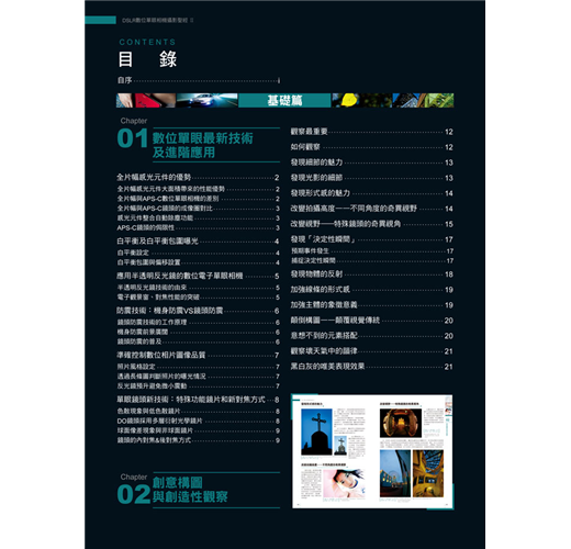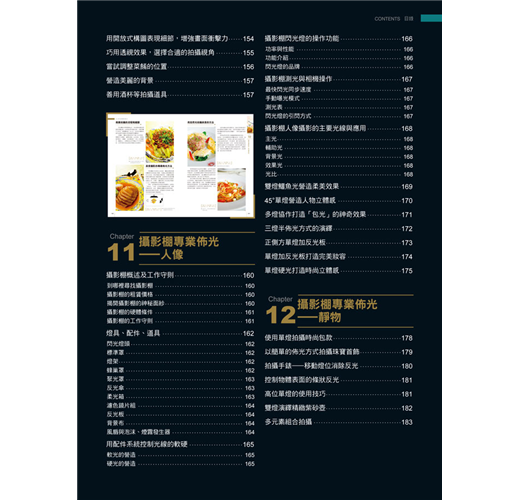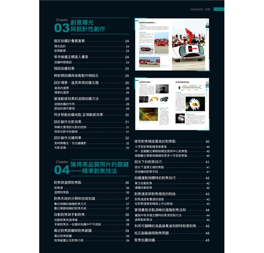 本書共分為基礎、實拍、後製、資源四篇,作者以商業攝影師的角度,從介紹最新攝影器材規格、技術切入,剖析攝影的構圖、用光、對焦技巧,以8個商業攝影實拍技法,帶領讀者學習專業攝影課題。並以數位攝影最大的優勢──照片後製處理,使讀者熟悉專業數位攝影的精髓,最後再以自身經驗,介紹商業攝影師的一些相關資源。