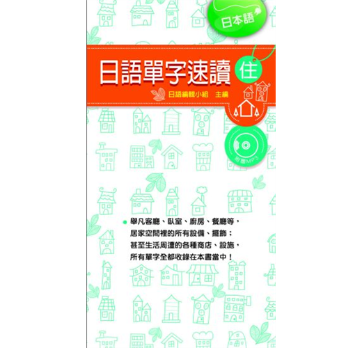 本書為『日語單字速讀~住』。全書編排方式,採用關聯字的編排法,也就是將同性質、相類似的居住相關單字都放在一起。如此一來,既方便讀者查詢,又有助於讀者記憶,可謂一舉兩得。而且為了讓版面更加活潑,每個篇名頁都會放上與內容相關的可愛插圖,並留有筆記欄,方便讀者增補新單字。