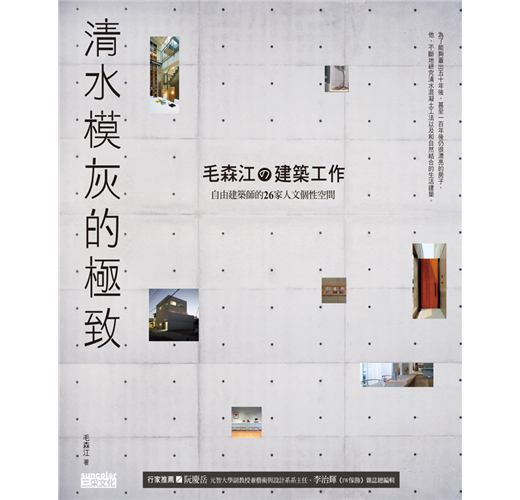 本書將由清水模建築達人毛森江先生分享在台灣設計、建造的26件作品,除呈現出獨樹一格的建築風采與特色,最重要的是,透過這些建築設計,達到與自然融合的舒適空間,讓人們可以輕鬆自在的生活或享受在其中,這也正是毛先生眼中的好建築。