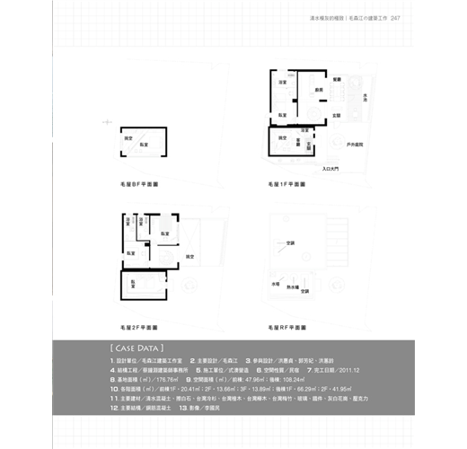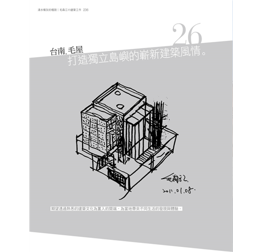 毛森江操作建築的方式,與台灣的當代建築人不相同。他能從更上游的土地買賣以及產品開發的判斷,到最下游施工交屋以及與使用者細膩的直接交手,都可以親身參與不致缺席。因此可從本書中一窺台灣建築人,實實在在地從設計到施工建造,再到內部家具物品的陳設的完整作品呈現。