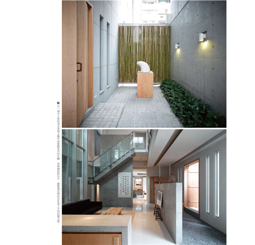 由大門進入二樓客廳,放眼可見立面窗外挑空的戶外庭園,層層細流的水瀑,一方水塘,以清水混凝土灌注的椅子,一旁高挑的椰子樹,這是位於二樓的空中庭園,由客廳走進此戶外庭園,往下另有一動線通往一樓的臥房(父母房),洗石子的階梯、溫潤的清水混凝土牆面,根根細竹建構的古意竹牆,幾顆浮於水面的石頭,融合成靜謐簡練的氣息,隨處可擷取的風景使深邃的庭園設計,看似孤立於空中,卻隱含著無限的延伸。