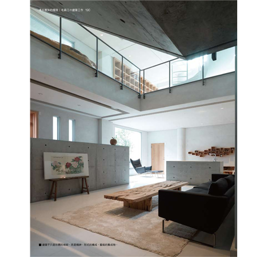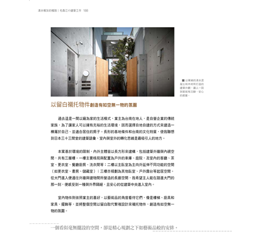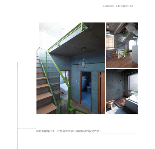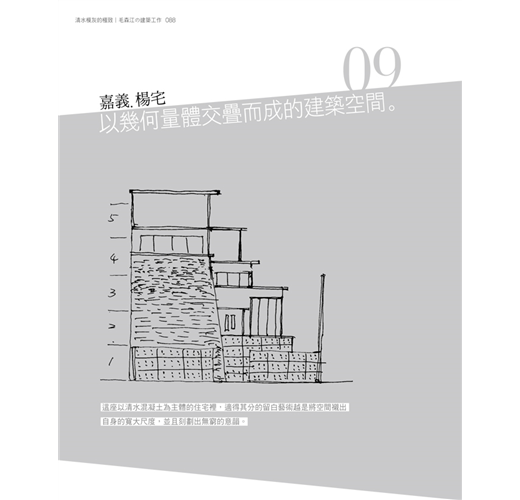 2.書中除了分享作者人生大轉變走入建築的小故事之外,主要在於作品的分享與介紹,從一張張的手繪稿開始,一篇篇夢想成家的故事真實上演。包含在建造前、中、後,與屋主的互動關係、設計的靈感,還有許多精緻的室內外照片及平面圖等。除了能夠了解毛森江對於人生目標的堅持與努力之外,更能從中領略清水混凝土建材的無窮魅力與作者本身的建築、居住觀。