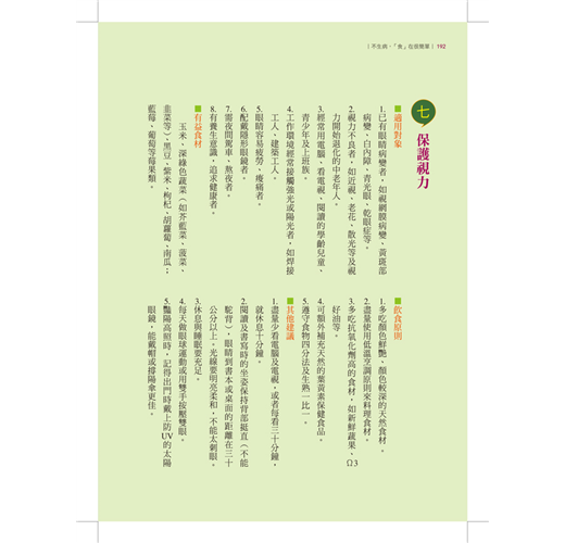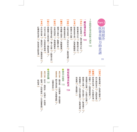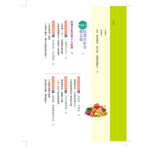 Ø飲食8大原則,抗發炎、抗百病──結合自然醫學和營養學的專業,完整歸納飲食八原則,包括「食物四分法」(每餐的蔬菜、水果、蛋白質、澱粉類各占四分之一)、「生熟食一比一」(生食和熟食各占一半)、「多吃好油、少吃壞油」、「多喝潔淨水」等等,並提供八種聰明外食的選擇和四種不同情境的點菜法,外食族也能吃得安心又健康!