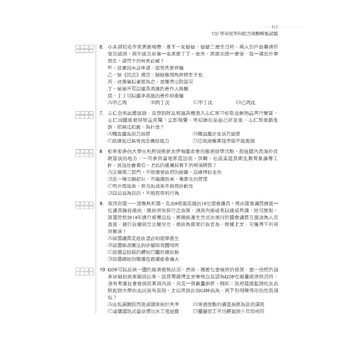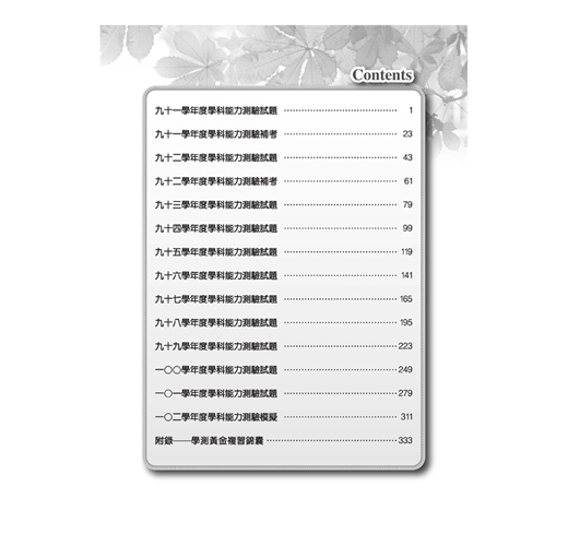 本書除了收錄完整收錄大學入學考試中心公布自九十一年至一○一年的學科能力測驗試題,讓您在練習中掌握考試題型,更依照歷年考情趨勢,編修最新的一○二模擬試題供學生自我檢測,抓住複習重點,在您在大考中輕鬆奪魁!