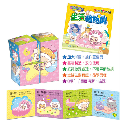 本書中介紹喜羊羊Q版系列人物,記錄著羊羊們的生活片段。每組由4顆拼圖粒拼成,加大的拼圖粒讓幼兒操作時拿取容易,畫面更完整,讓初次接觸6面立體拼圖的幼兒,可以獨立完成增加成就感。每種活動還附有一首短謠,讓幼兒手、腦、眼並用,學習更多元。