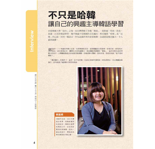 郭盈君,一個很平常的台灣女孩,看似個普通的哈韓族,在她心目中,韓國文化有何吸引人之處,以讓她一頭栽入韓國的世界?來看看她如何加快自己學韓文的腳步,打入韓文的奧祕領域。