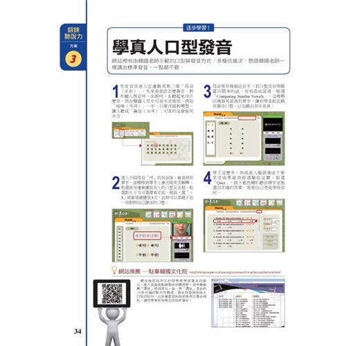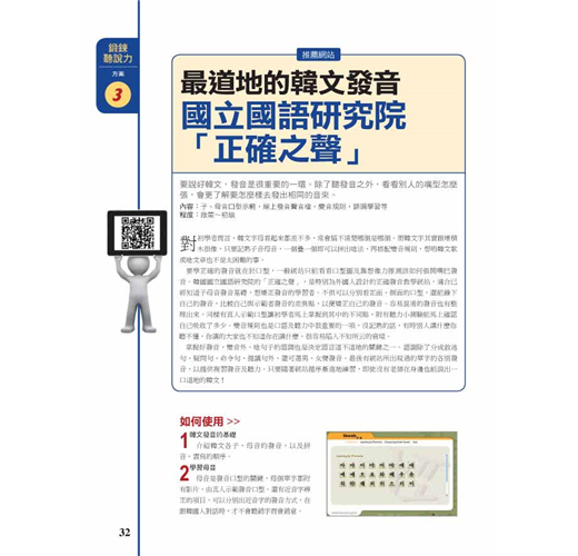 「Read My Lips!」看韓國老師發音時的嘴型,再照鏡子看看自己的,很容易就能找到正確的發音竅門;配合日常會話課程及新聞韓語的網站,讓韓文發音一天比一天道地。