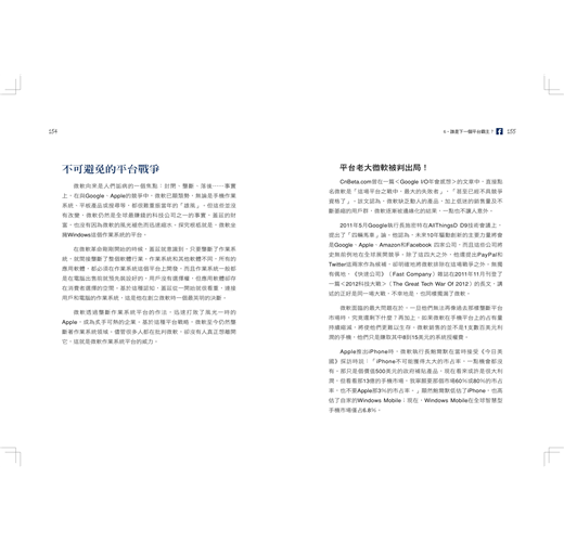 為迎接這場世紀之戰,Google建立了Android系統和Google+,壯大資源;Appple則透過硬體結合應用程式,綑綁住無數蘋果迷與遊戲開發商。面對Google與Apple雙面夾攻的平台策略,Facebook也必須積極尋求開發硬體設備,鞏固勢力。當他們全力廝殺的同時,不禁令人好奇,是什麼樣的商業模式,讓Facebook得以在短時間內迅速竄起,與Google、Apple匹敵?