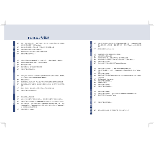 今年2月,Facebook挾帶著強大聲望,宣佈首次公開募股(IPO),計畫融資50億美元,成為史上最大募股金額,並讓Facebook市值預計達到900億美元;會有1,000人因為Facebook上市,而成為新千萬富翁。Facebook短短8年,從誕生到上市,你我都見證了這段歷史。