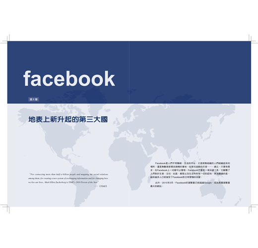 最後,我最想鼓勵草莓族的年輕朋友們來看看這本書。當社會上普遍用「靠爸族」、「無夢世代」來描述7年級生時,今年26歲的馬克‧佐克伯,秉持對人性細緻的觀察、無限的創意、大膽的假設、扎實的技術專長及大無畏的行動力,全力成為獨一無二的自己。我堅信每個世代都會創造出屬於自己時代的奇蹟,奇蹟個個不同,但可以確定的是,這些奇蹟都將變得更具影響力、對生活更加重要。
