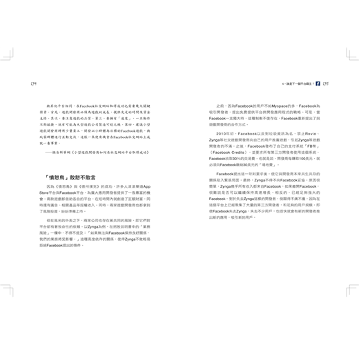 相對地,在Facebook平台上,佐克伯也構建了一個以Facebook為基礎的經濟圈,很多公司也在這個平台上聲名鵲起。而且,與Apple、Google等平台相比,Facebook的優勢在於作為社交網站,它有一個動態新聞的功能,該功能可以提醒用戶他們的好友下載了哪些應用,在玩什麼新遊戲。這種方式不會讓開發者花費任何行銷費用,卻可以達到很好的宣傳效果。