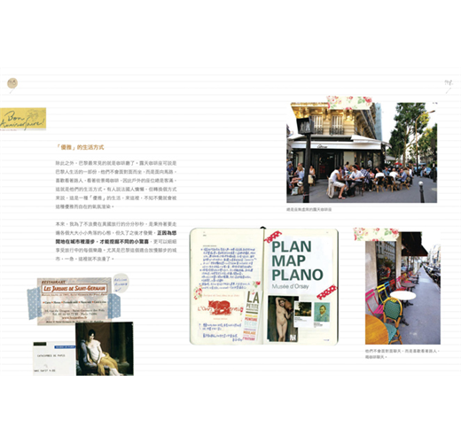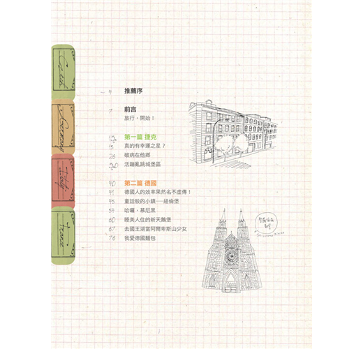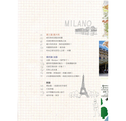 她用手帳記錄下了捷克建築之美、德國的童趣夢幻;可愛到犯規的義大利景點及無敵厲害美食;花都巴黎的浪漫與優雅,學法國人在假沙灘真日曬、躺在公園草坪悠閒野餐……