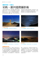 針對「黑卡」、「包圍式曝光」、「多點對焦法」、「高反差/星軌疊圖」、「必備器材」等主題提供達人們獨家的攝影技巧教學,以及應該注意的各種器材參數設定。