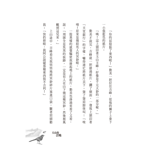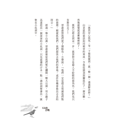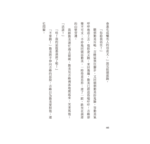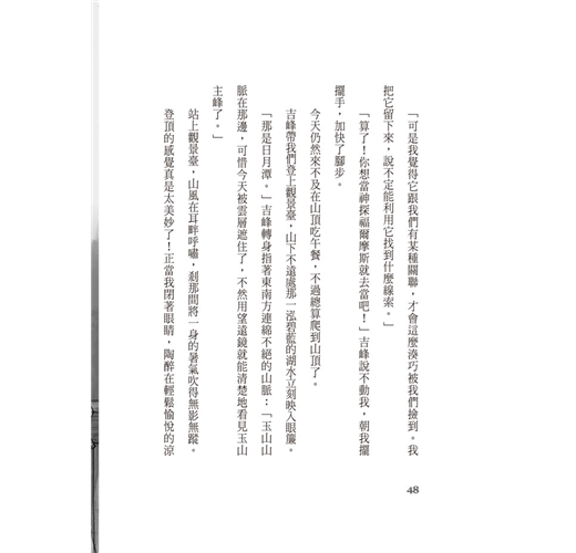「這一定是吉峰要我帶勤美逃走時,偷偷塞進我背包,好讓我當作報警的證物。」我將玉山雕像捧在手心,心中立即產生一種強烈的感覺—我們三個人的命運,就如同雕像上頭那三道明顯的山稜,雖然彼此分開,最終還是沿著山脊緊緊相連。