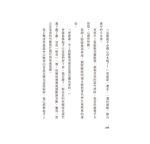 我的視線越來越模糊,如同進入夢境一般,又看見光頭男孩站在玉山主峰,在朝我招手。恍惚之中,我停不下腳步,迎面和他撞個正著,接著便跟他合為一體,騎著水鹿,在幽暗的森林中狂奔。周遭的峭壁和巨木晃眼即逝,只聽到山風在我耳畔呼嘯,呼嘯。