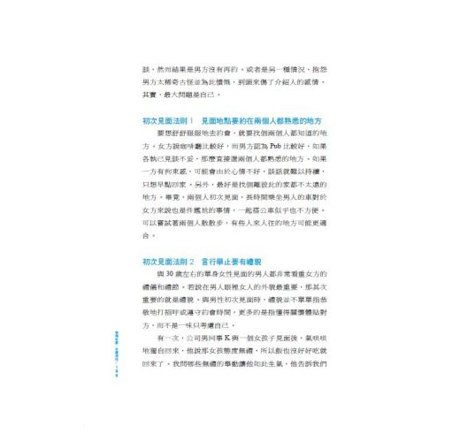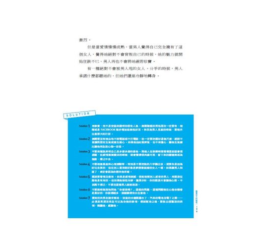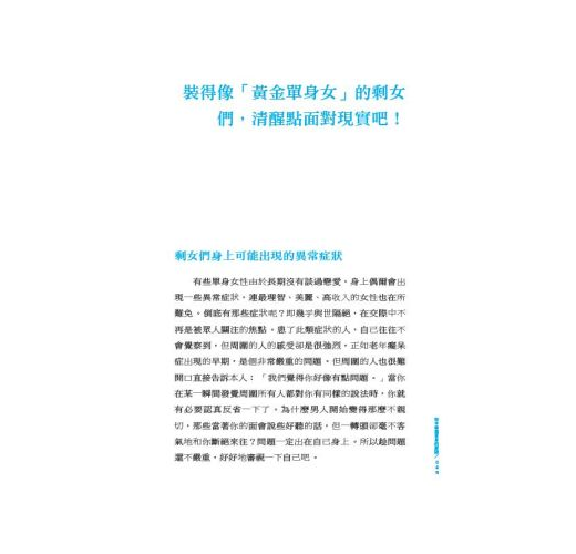 在這本書裡作者會說明許多單身男女的真實情況,而且都不是溫暖的安慰或是麻醉言語,而是些直接的言語和中肯的忠告,這些話可能不太好聽,甚至會讓你抓狂。因為作者要揭穿關於愛情的「不變的真理」,和那些隱藏在美好畫面下的殘酷真相。男人到底是怎麼評價那些大家都說「聰明伶俐又高貴漂亮」的單身女人?沒有人敢說出來的難聽話是什麼?還有得到幸福和愛情的具體方法又是什麼?如何在第一次見面就抓住對方的目光?