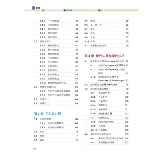 不論是以色彩基礎,紅、橙、黃、綠、藍、靛、紫等七種色系來搭配,或是必須採用各種形容詞所描述的色彩搭配方式,例如懷舊、熱情、可靠、流行...等印象配色,本書都能為您提供各種創意的配色方案,在您苦於思索配色的同時,提供您創意的配色靈感。
