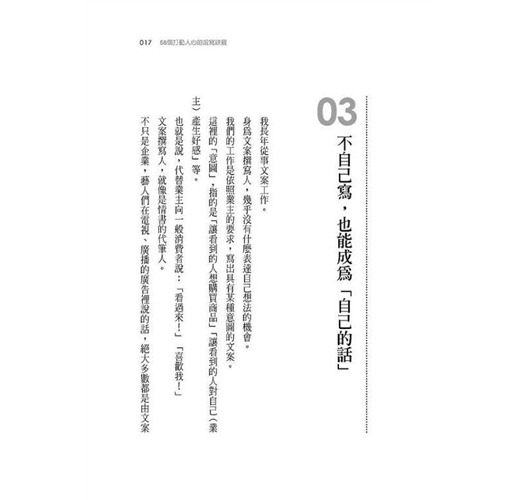 ‧這的的確確是用作者自己的話在闡述的書,透過豐富的比喻和舉例,對於「自己的話」下了一個相當有意思的定義。分作58個訣竅,就算平時很少看書的人也能輕鬆閱讀,是近來讀的商業書中最推薦的一本。 ~愛占卜的J