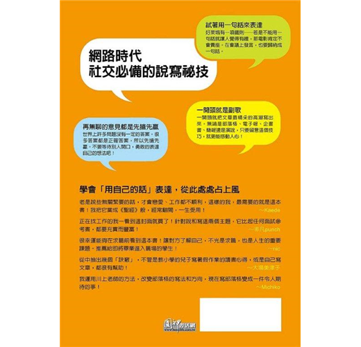 ‧這不只是商業書,從中抽出幾個「訣竅」,不管是教小學的兒子寫暑假作業的讀書心得,或是自己寫文章,都很有幫助。是任何世代、任何場合都能派上用場,相當實用的一本書。 ~大場美津子