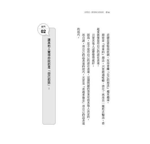 「自己的話」亦然。只要將既有事物重組即可。不管這句話原本是誰說的,只要和自己的經驗、感想,與從書本等處獲得的知識重新組合在一起,就是「自己的話」。