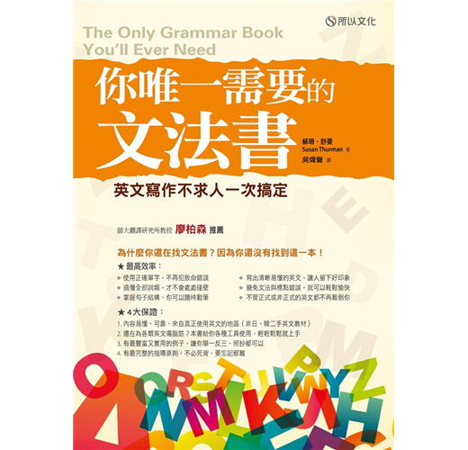 《你唯一需要的文法書》是一本美國老師寫給美國讀者看的暢銷文法書,台灣讀者更可受惠良多。書中對英文文法的闡釋言簡意賅、操作性強、又具豐富實例,同時提供英文拼字標點規則、文法句構觀念和各式文體的寫作技巧,充分體現The only grammar book you’ll ever need的精神,可謂一舉數得。講求學習效率的現代讀者,可用本書取代厚重如磚、繁複抽象的傳統文法教科書。