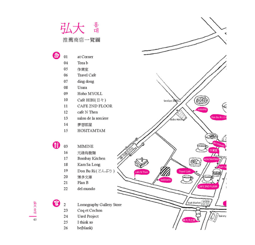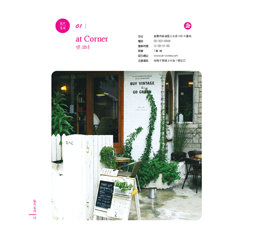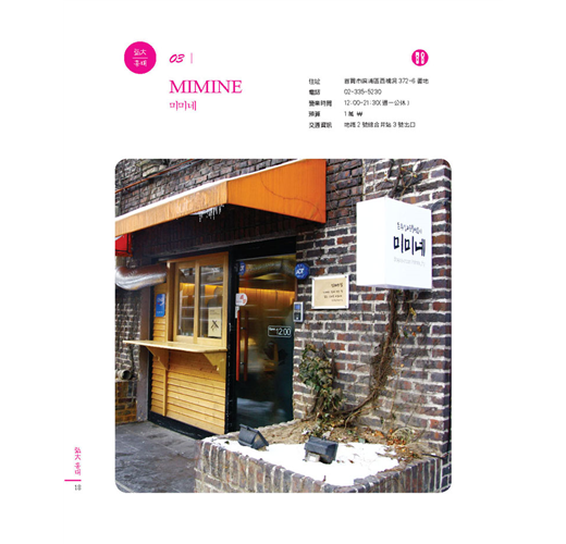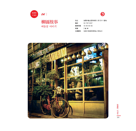 以地區別劃分,蒐集弘大、梨大、梨泰院、三清洞、新沙洞、光化門、狎鷗亭等道地美食餐廳、酒吧,讓身為美食達人的妳一定要細細品嘗。