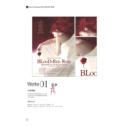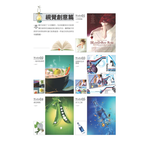 • 全書包含34個完整的範例,包含視覺創意、插畫、質感表現、網頁等四大篇內容。