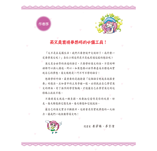 想要學好外語,最重要的是抱持著「這個語言對我來說很重要」的想法,正如書中的主角步瞳一樣,必須找出自己學習英文的理由,有了強烈的學習動機,才能讓自己在學習英文的這條路上孜孜不倦。不要將英文視為一種負擔,而要把它當作是你的死黨、好朋友。每天都想與它想見面,每天都想和它說說話。讓自己的英文實力不斷提升,這將會是你實現夢想的一大助力,讓我們一起快樂學英文吧!