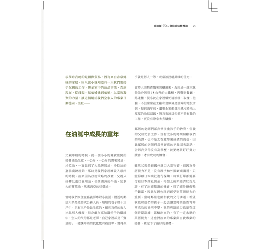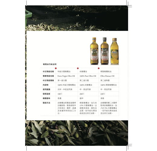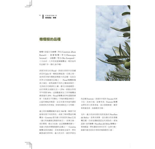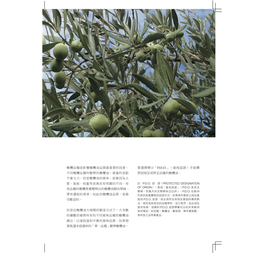 本書跳脫純教條式的知識文字書,更不僅只有教讀者如何使用橄欖油製作料理,而是由經過國際認證的品油師Ellen,帶讀者從源頭:種植、採收、處理、壓製,到品油。並安排知名主廚料理示範,更介紹多家推薦的優質橄欖油料理餐廳。以精緻的視覺與淺顯易懂的文字,讓橄欖油也如紅酒、咖啡般的成為生活品味的一部分。
