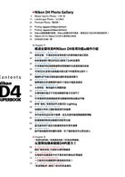 以上所提的,僅是本書所介紹到的一小部份而已,更多關於D4的優異性能以及開發秘辛(研發人員專訪),請各位務必親自體認。當然了,能夠100%發揮D4超高畫質的交換鏡頭,亦即各式專屬的配件也都將會一一地為讀者們詳盡解說。