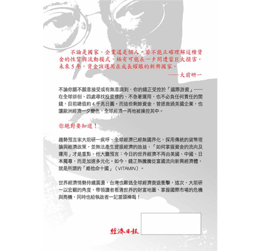 趨勢預言家大前研一疾呼,全球經濟已經無國界化,採用傳統的貨幣理論與經濟政策,並無法產生提振經濟的效益,「如何掌握資金的流向及運用」才是重點。他大膽預言:今日的世界經濟,已不再由美國、中國、日本獨尊,而是加速多元化。如今,錢正熱騰騰從富國流向新興經濟體,他稱之為「維他命十國」(VITAMIN)。