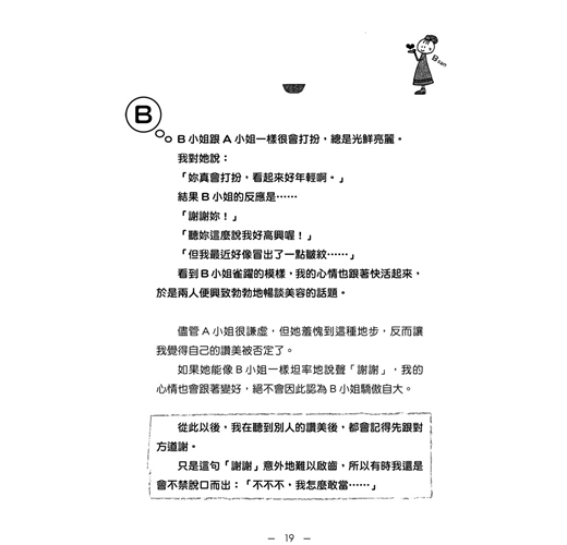 面對同樣的情況, 不同的態度會導致結果大不相同,如果你覺得自己老是掌握不到與人相處的要領──談得來的朋友愈來愈少、職場上的應對不能面面俱到,甚至感情世界也無法順利進展──那麼請務必透過本書一一檢視自己的生活,人際關係沒有標準答案,有時只要多一點不經意的體貼與細心,就能為你贏得宇宙無敵好人緣!!