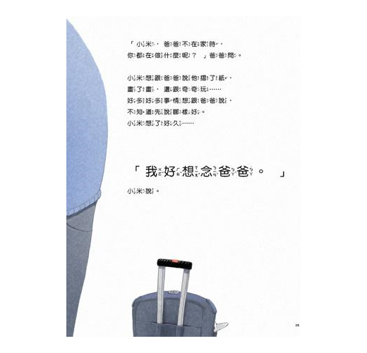 而答案就藏在圖中,例如天空飛過的飛機、小米手上畫著╳╳○○的日曆紙、只擺著兩子的圍棋盤……都在暗示爸爸出門了,小米心中的失落和思念。