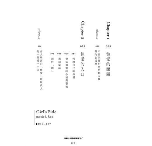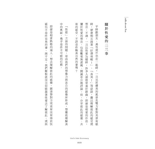 那麼,女孩們呢?無論正確與否,當男孩們可以靠著相互討論、分享A片來獲得性知識時,亞洲文化圈中的女孩,便處在相對缺乏討論與接觸性知識的環境中。有人說,女人要到三十歲後才能真正理解性愛的愉悅。某個程度上說來,的確如此。除了與生俱來的身體構造之外,女孩本身對性愛難以啟齒的疑惑,與社會上容易把「了解性行為」與「淫亂」畫上等號的集體氛圍,都讓女孩們延遲了理解性愛美好的時機,甚至錯失了保護自己的機會。