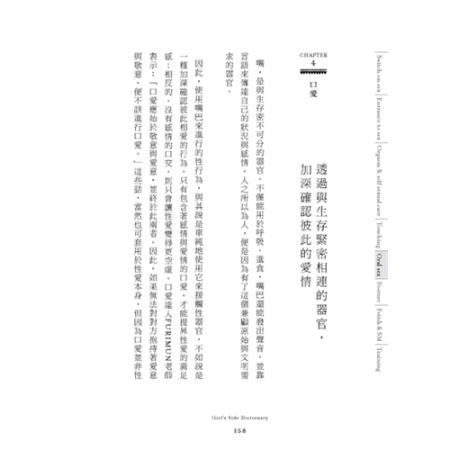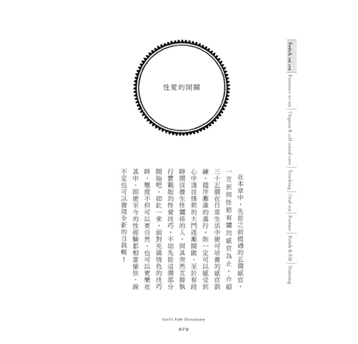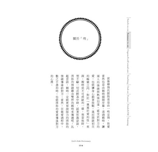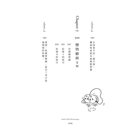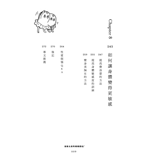 當初接到這本書時,不但讓我喜不自禁,在翻譯過程中,書中的細膩之處更是屢屢讓我拍案叫好。這本《寫給女孩的壞壞愛技》,分章論節地提出女孩們面對性愛時可能出現的疑惑與掙扎。書中不斷強調,性愛應該是美好的,甚至請出了社會學與日本文學的專家,透過他們的專業角度,告訴每個女孩們──性愛本就是建構人類社會的基本元素之一,無須羞赧,更不必感到骯髒。
