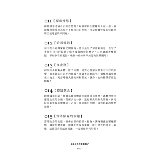 解決了心理層面的疑惑後,書中更進一步告訴妳該怎麼提昇自己的女性自覺與魅力。因為懂得先愛自己的人,才能懂得怎麼釋放自己的魅力,讓別人也臣服於下。之後,便進入到提高身體感受度的課程。對性經驗豐富的女性來說,高潮就像好男人一樣可遇不可求。因此,學習如何提高自己身體的敏感度,也是幫助自己體驗性愛極樂不可或缺的方式之一。此外,書中滿載的性知識,小至分析男女不同的性感帶、自慰方式、大到實戰甚至SM的技巧,都能讓妳大開眼界、獲益良多。讀完本書,妳也可以成為自己的性愛小老師。