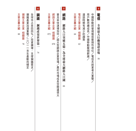我們非常自信地告訴各位,詳讀書內的各項產業關係圖,必能精簡地掌握中國經濟發展動向。如果讀者能利用本書,作為拓展中國大陸市場、研究中國經濟或投資中國股票,都將令我們感到榮幸與欣慰。