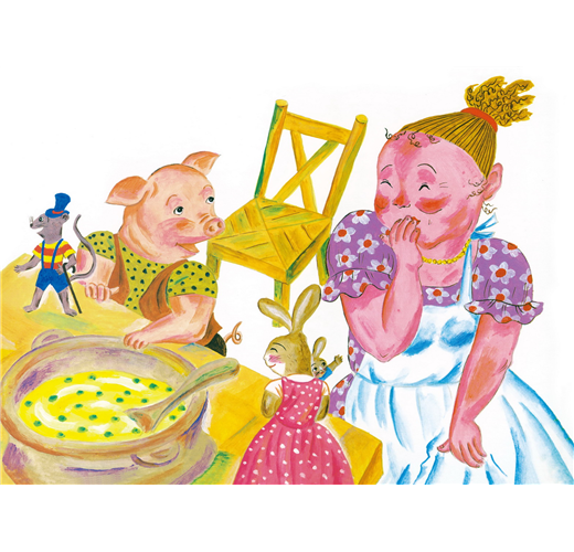 鍋子裡美味的豆子湯傳來陣陣香味,實在讓人口水直流。動物們忍不住了,紛紛說要嚐一口豆子湯。結果,大家都異口同聲稱讚豆子湯好好喝。瑪歌婆婆聽了,一時不小心說溜了嘴:「當然啦,這可是最會做菜的梅歌婆婆煮的湯喔!」梅歌婆婆嚇了一大跳,連忙說:「當然囉,這可是種菜專家瑪歌婆婆種的豆子啊!」