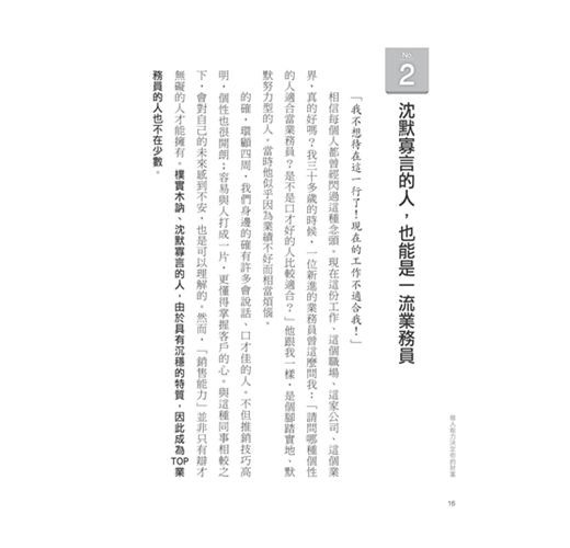 這77項做人能力,不僅是業務員的銷售聖經,對於目前工作遇到困難沮喪,止步不前的你,更是獲得自信與勇氣的信條。作者提到「當你迷惘時,請記得選擇辛苦的那一條路」即使這樣不論經驗是失敗或成功,都能為自己帶來力量。能勇敢面對困難,並努力解決的人,才會受到主管、客戶的高度評價。成功沒有捷徑,迷惘是必然,多留一點汗水,你的人生一定會有所成就,這些獲得信心及勇氣的信條還有: