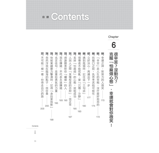《本書特色》本書共分成6個章節,77則服務心法,每一則都穿插作者在職場上的實戰經驗,書中也引用多