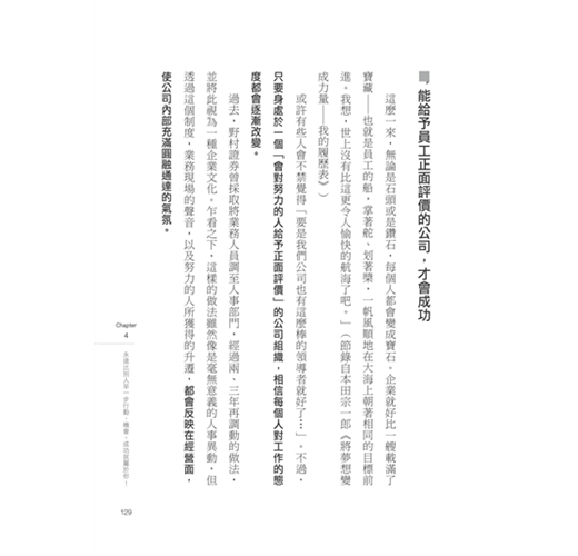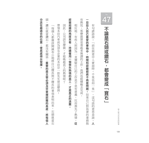 然而社長聽到他的答案後,便說:「這樣啊,你覺得好玩啊。那麼你就不需要薪水囉?是不是還應該向你收入場費呢?我跟你說,每一份工作,一開始一定是很無聊的。可是如果永遠都很無聊,那就是當事者的責任了。因為工作的樂趣是要靠自己去發現的。」