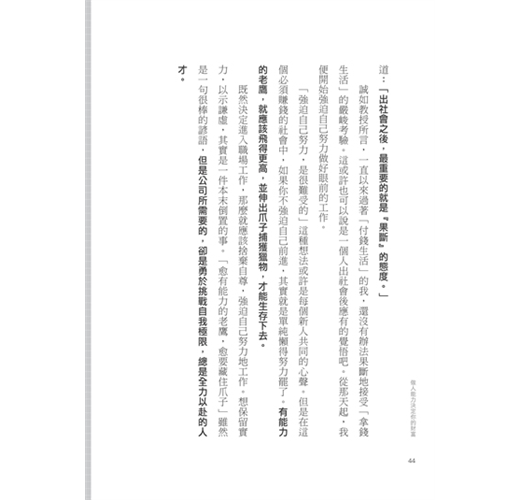 誠如教授所言,一直以來過著「付錢生活」的我,還沒有辦法果斷地接受「拿錢生活」的嚴峻考驗。這或許也可以說是一個人出社會後應有的覺悟吧。從那天起,我便開始強迫自己努力做好眼前的工作。