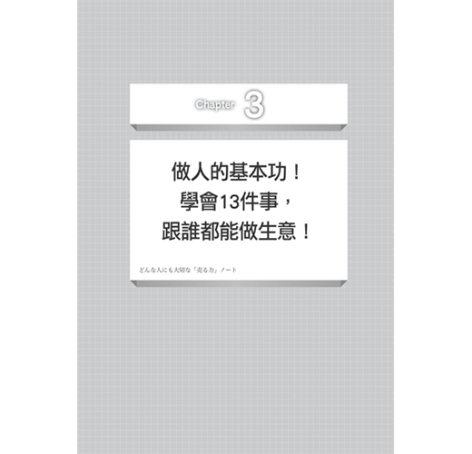 作者從二十多歲起,便每天孜孜不倦地寫著筆記,也就是這本「備忘錄」。筆記中記載了在嚴峻環境下求生存時,對每個人都很重要的77個「銷售能力」,讓你體會「銷售能力」=「做人能力」的筆記,透過本書大公開。