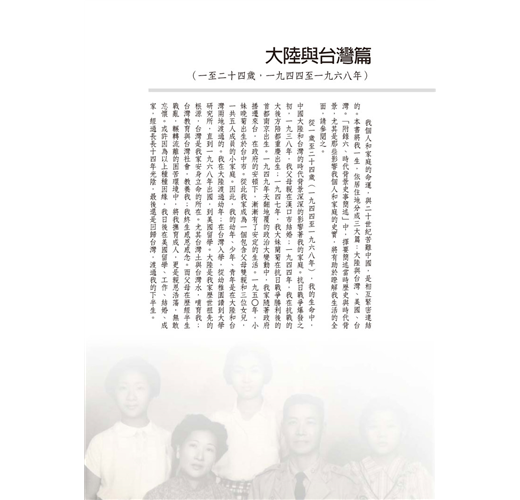 二十世紀一九四九年,近代中國經歷一場政治大變動。執政的國民政府撤守台灣,二百萬軍民(註1)遷徙來台。我的父母即是在這場大變局的浪潮中,攜帶稚齡的我和妹妹來到台灣。我五歲自大陸渡海來台,從幼稚園至大學,在台灣接受完整教育;其後到美國留學,結婚成家,投入職場;最後又回歸台灣,從事教育工作,服務鄉梓,迄於退休。
