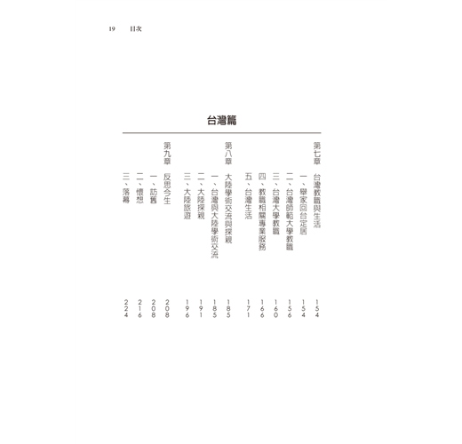 本書共分九章,以學術生涯為主軸,以個人編年回憶錄方式呈現。述說作者的先世、父母與家庭,求學、工作與教學,在大陸、台灣與美國的生活,到海峽對岸的學術交流與探親,閒暇時的休閒與旅遊。此外亦述說子女的出生、養育與教育。最後一章則記下作者所思所想的吉光片羽,以及反思今生的絮語。