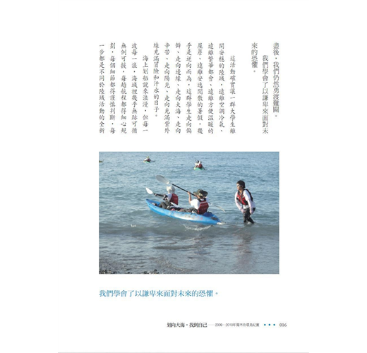這活動確實讓一群大學生離開安穩的陸域,遠離空調冷氣、遠離繁華都會、遠離方便溫暖的屋簷、遠離安逸閒散的暑假,幾乎是逆向而為,這群學生走向偏僻、走向邊緣、走向大海、走向辛苦、走向陽光、走向充滿紫外線充滿冒險和汗水的日子。